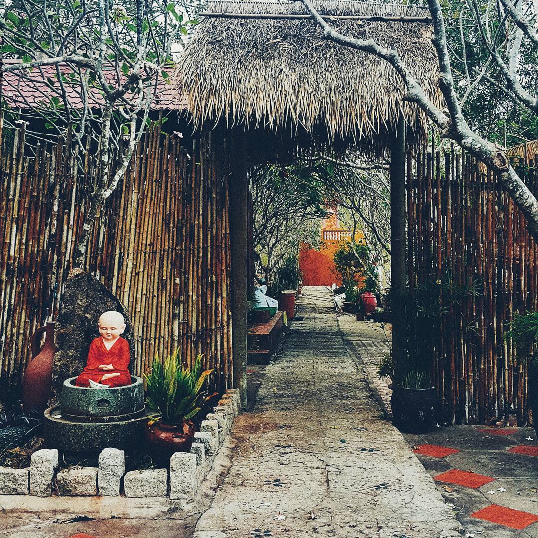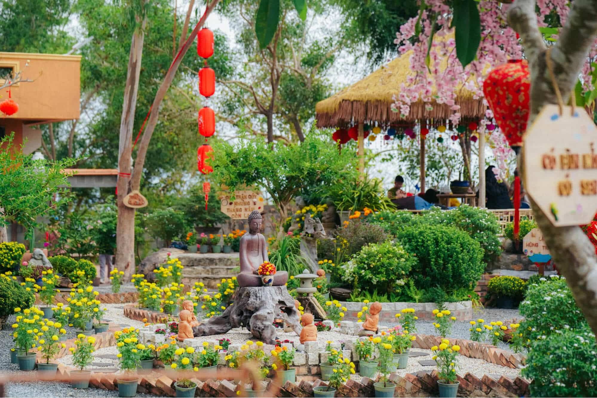 Ngay khi bước qua cổng tam quan, du khách sẽ cảm nhận được sự khác biệt rõ rệt: tiếng gió thổi vi vu hòa cùng tiếng chuông chùa ngân vang, tiếng sóng biển vỗ bờ như khúc nhạc thiền du dương. Hai bên lối đi là hàng cây cổ thụ rợp bóng, xen lẫn những chậu hoa, bonsai được chăm sóc tỉ mỉ, tạo nên khung cảnh vừa trang nghiêm vừa gần gũi.