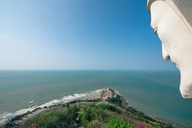 Từ độ cao của mũi đất, cảnh vật mở ra như một bức tranh toàn cảnh. Phía xa xa là đường chân trời nơi biển và trời giao nhau, phía sau là núi Nhỏ phủ xanh cây lá, phía trên là tượng Chúa Kitô Vua sừng sững như đang giang tay che chở. Cảnh sắc ấy vừa hùng vĩ, vừa thơ mộng – hội tụ đủ cả sức mạnh của thiên nhiên lẫn vẻ đẹp của sự yên bình.