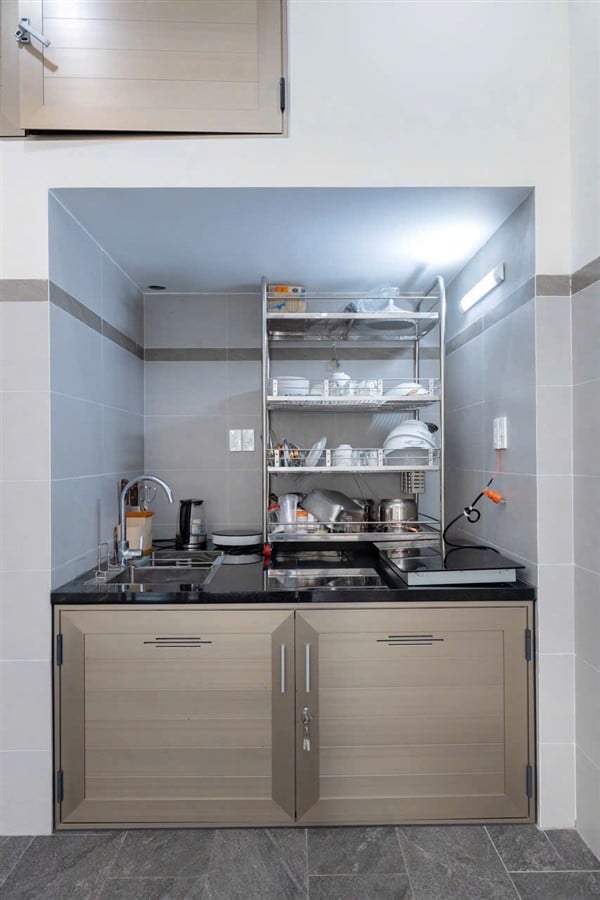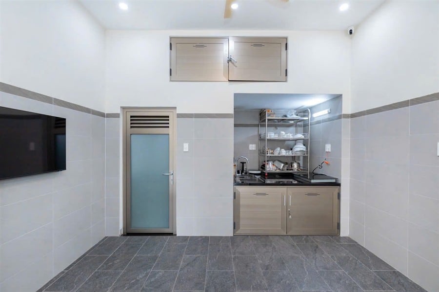• Bếp nấu ăn được trang bị: xoong nồi, chén bát, lò vi sóng, bếp từ, bếp lẩu, gia vị cơ bản