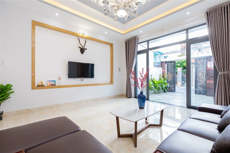 Phòng khách rộng rãi, các phòng ngủ đều có máy lạnh, tivi kết nối YouTube, máy nước nóng, máy sấy tóc, gương toàn thân