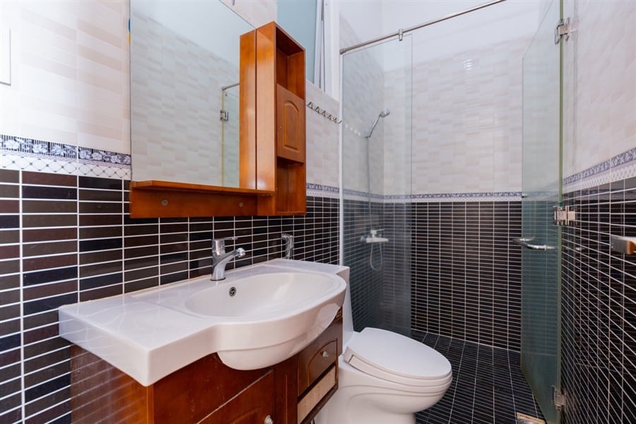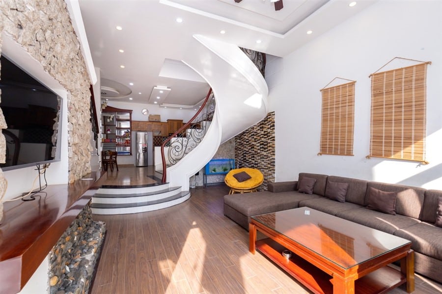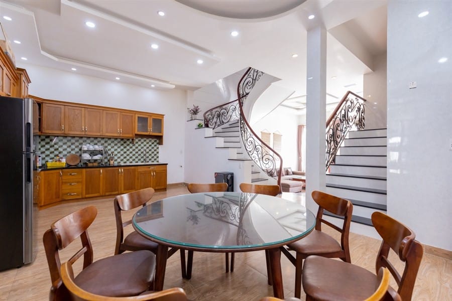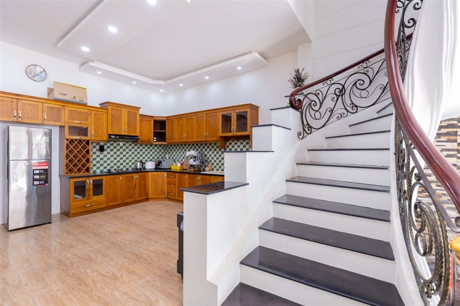 - Tầng trệt bao gồm 1 gara để xe, nhà bếp hiện đại và bộ bàn ăn cao cấp, 2 phòng ngủ đơn (WC chung trong phòng) và 1 phòng ngủ tầng lửng (WC trong phòng).