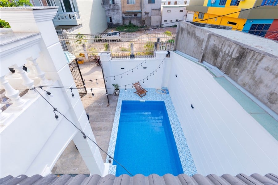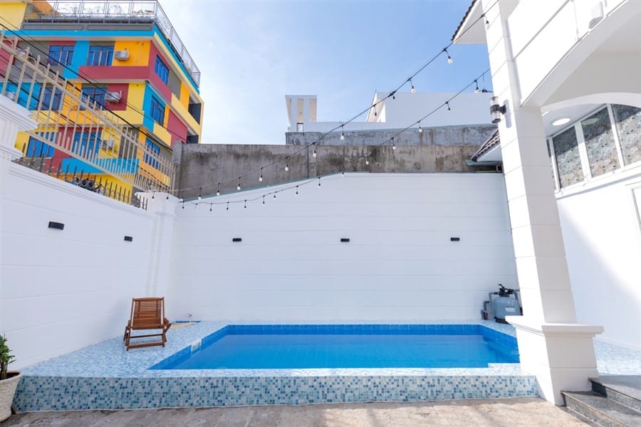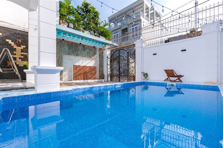 - Bể bơi riêng 30m2 với ghế nằm thư giãn, tạo nên không gian tuyệt vời cho các hoạt động giải trí ngoại ô.