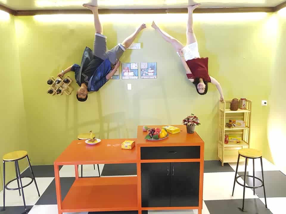 - Không gian đảo ngược với thiết kế độc đáo, từ nội thất đến vật dụng sinh hoạt, tạo nên hiệu ứng thị giác thú vị. Bạn sẽ có cảm giác như đang “lơ lửng” trong không gian và có thể chụp những bức ảnh với phong cách “không trọng lực”.