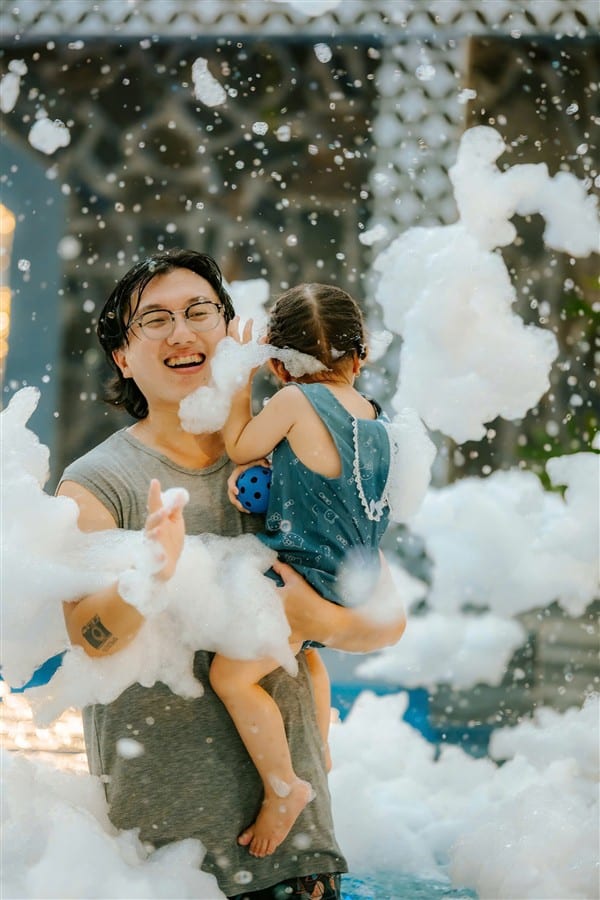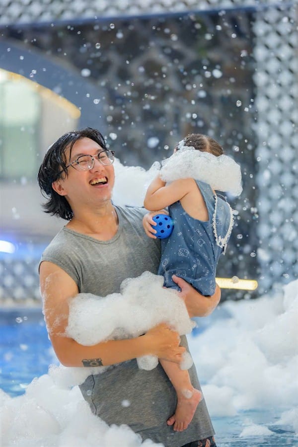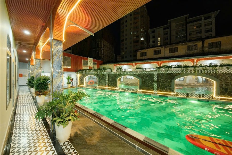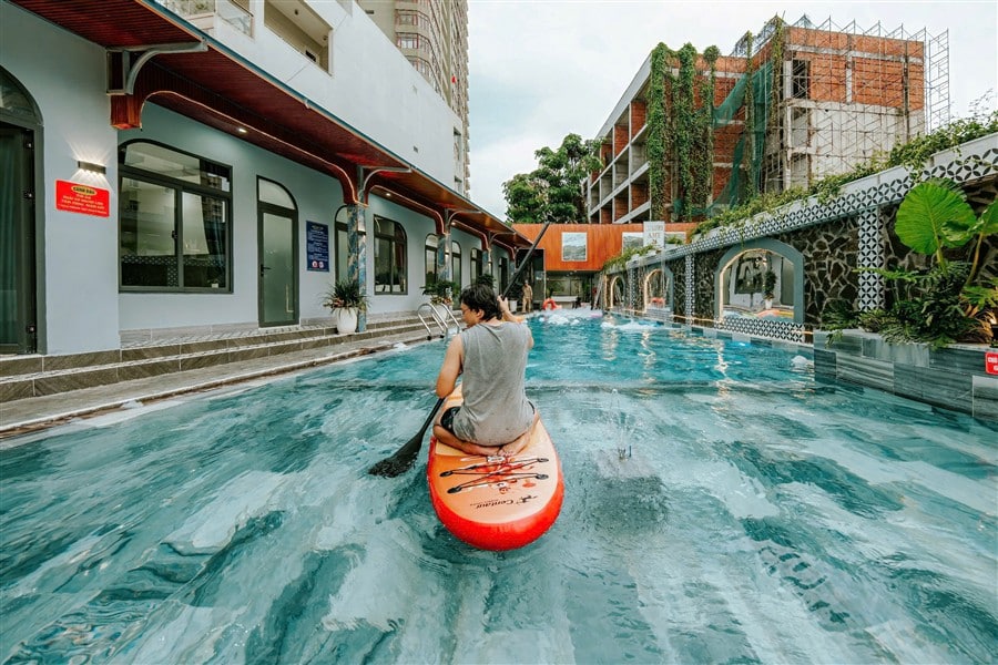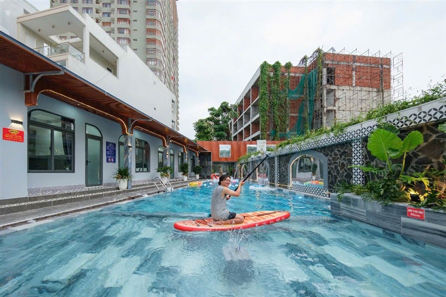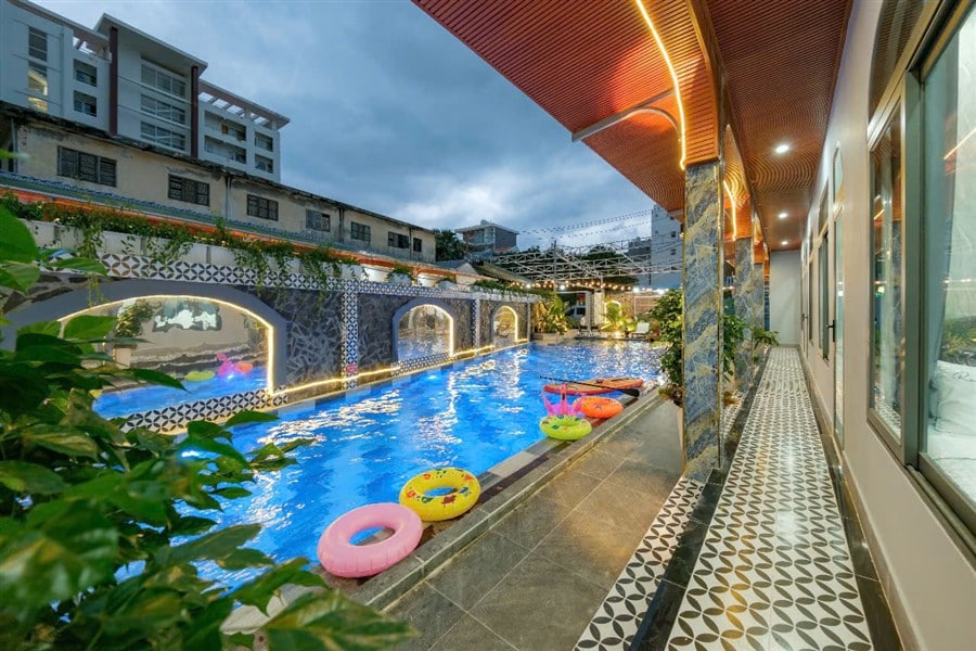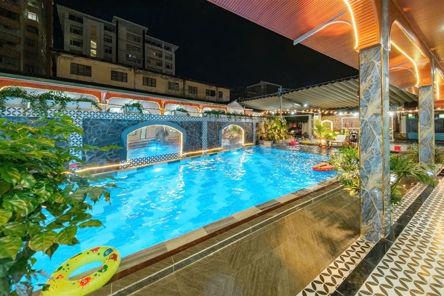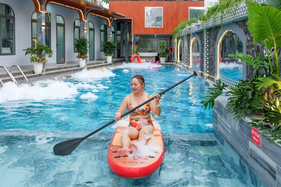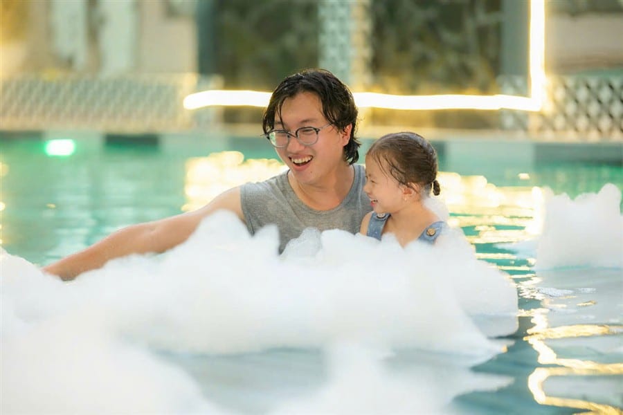 Hồ bơi 150m² rộng rãi, khu vực trẻ em 60cm, giàn phun nước, đèn hồ đổi màu, phao bơi, sup miễn phí và máy bắn tạo bọt tuyết cho trải nghiệm độc đáo.