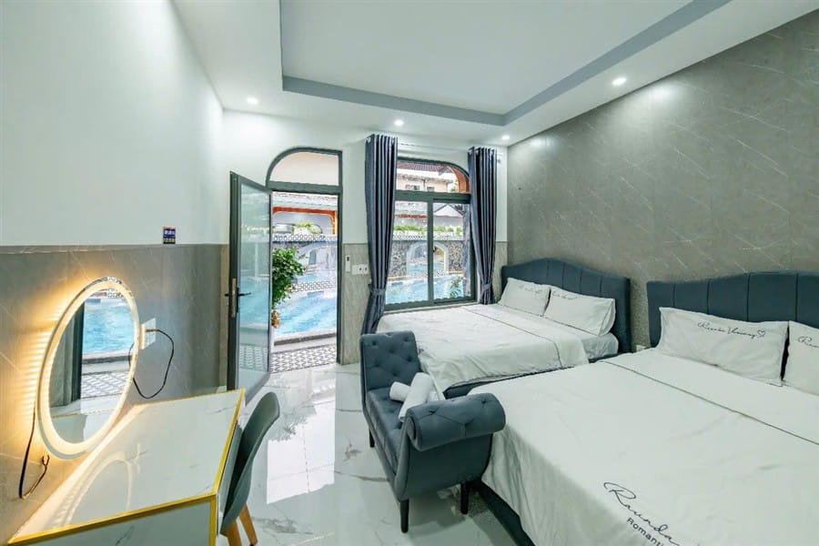 Tầng 1 và 2: 5 phòng đôi với 6 WC, hầu hết phòng có view hồ bơi hoặc nội khu, nội thất hiện đại, máy lạnh, tủ quần áo, rèm chống muỗi.