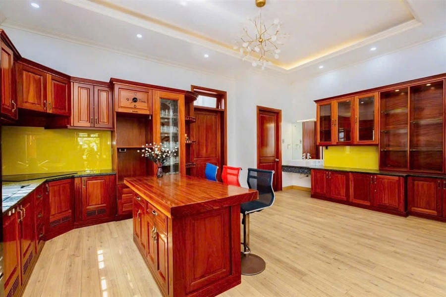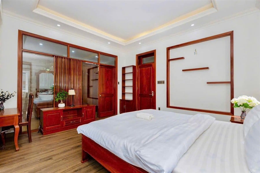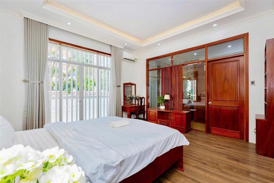 Bên trong villa, 5 phòng ngủ được bố trí hợp lý, gồm 3 phòng đơn và 2 phòng đôi, được trang bị giường êm ái, bàn trang điểm và gương toàn thân lớn, mang đến sự tiện nghi và thoải mái tối đa. Các WC được phân bố khoa học gồm 3 WC trong phòng và 3 WC ngoài, giúp đảm bảo không gian sinh hoạt rộng rãi và thuận tiện cho mọi khách lưu trú. Villa có sức chứa tối đa từ 20–25 người, phù hợp cho cả gia đình lớn, nhóm bạn hoặc các đoàn khách muốn có không gian riêng nhưng vẫn gắn kết.