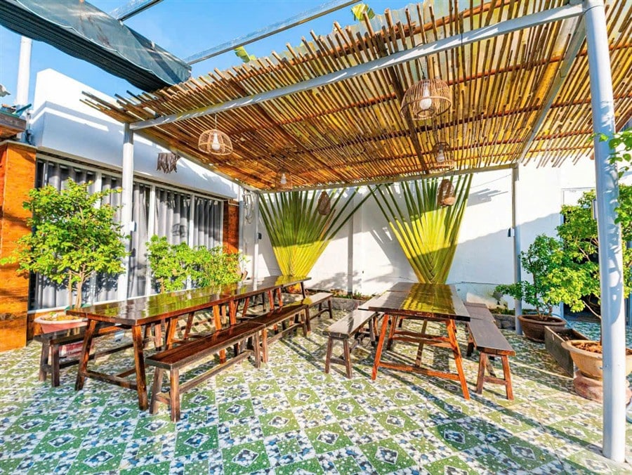 Sân vườn rộng rãi, có bàn ghế cho 20 khách, thích hợp tổ chức BBQ hoặc tiệc gia đình.