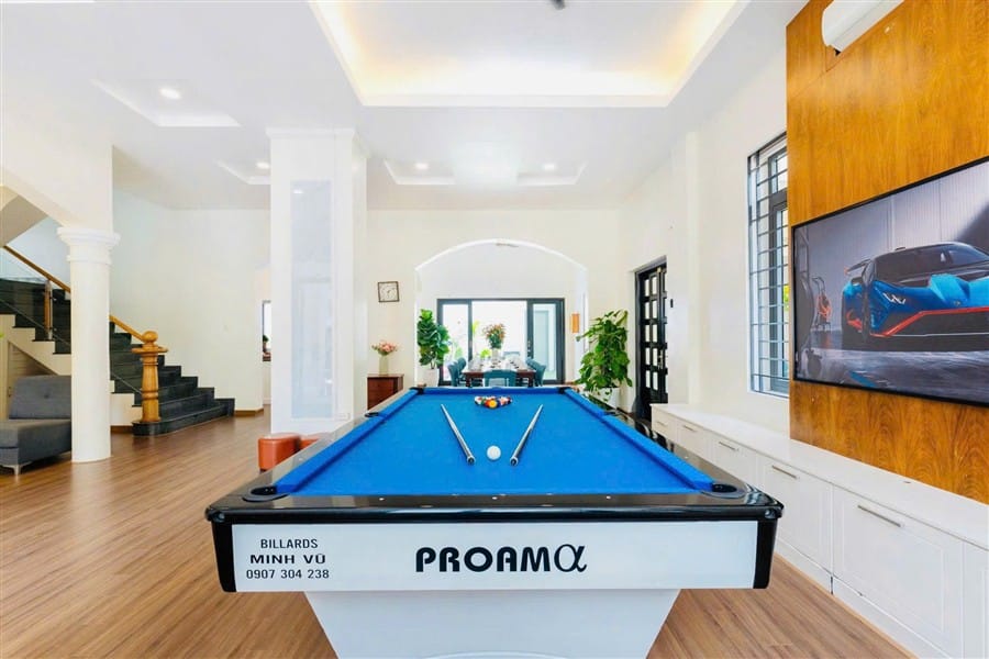 Bàn bida lỗ chuyên nghiệp, khu vực giải trí riêng.