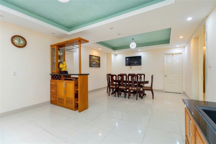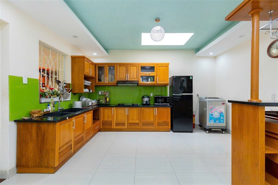Không gian bếp rộng, sạch sẽ, dễ bố trí tiệc nhóm.