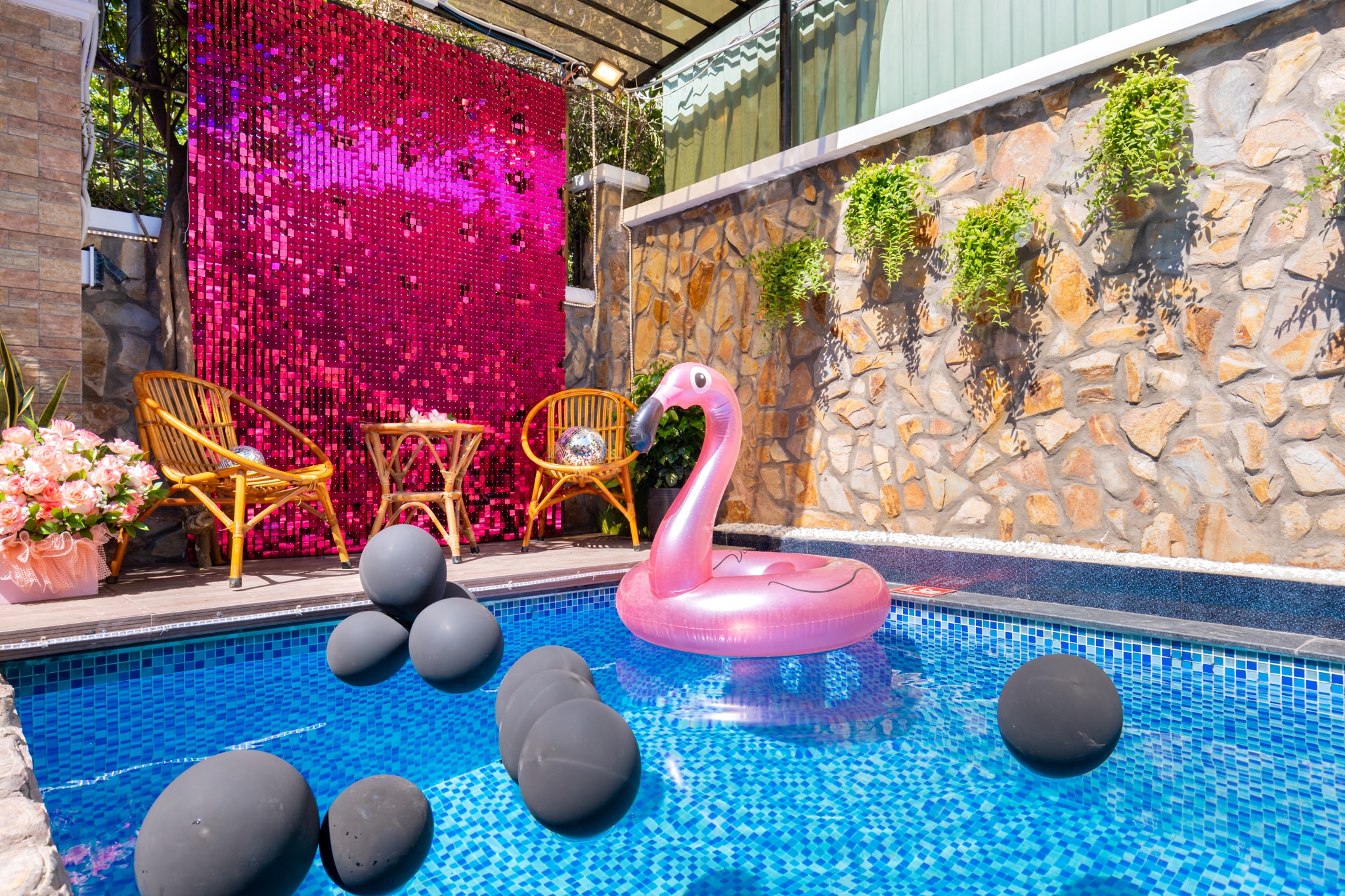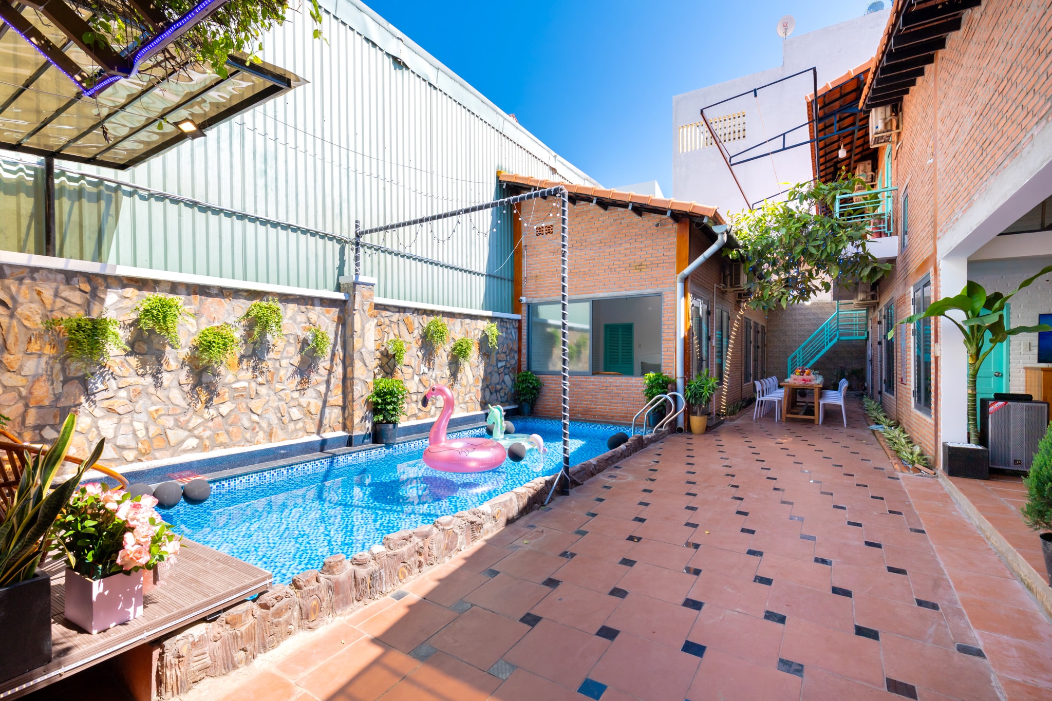 Với hồ bơi lớn kích thước 3x8m, Villa này có sức chứa lên đến 15 người lớn và 5 trẻ em. Ngoài ra, có các dịch vụ bổ sung như phụ phí thêm giờ, phụ thu cho mỗi người lớn và chi phí mở thêm phòng nếu cần thiết.