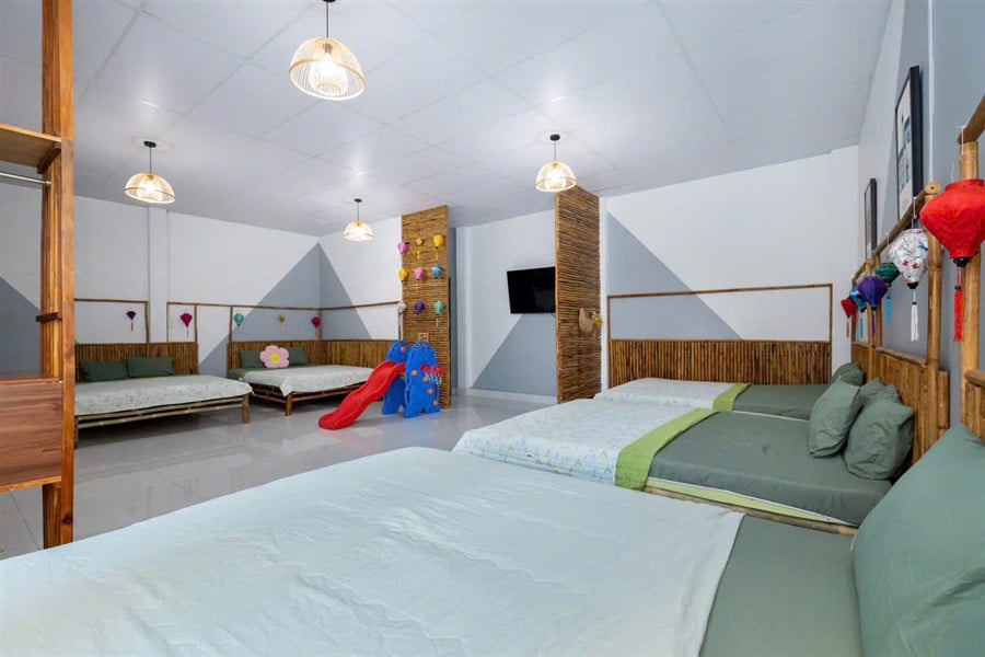 Villa bao gồm 3 phòng ngủ chính cùng 1 gác lửng, tổng cộng 7 giường và có thể sử dụng thêm nệm phụ, sức chứa tiêu chuẩn 15 khách và tối đa 20 khách (có phụ thu). Mỗi phòng được bố trí nội thất hiện đại, trang nhã, thoáng mát, tạo cảm giác nghỉ ngơi dễ chịu. Villa có 3 WC tiện nghi với vòi tắm nóng lạnh và đầy đủ đồ dùng cá nhân, đáp ứng đầy đủ nhu cầu sinh hoạt cho tất cả khách lưu trú.