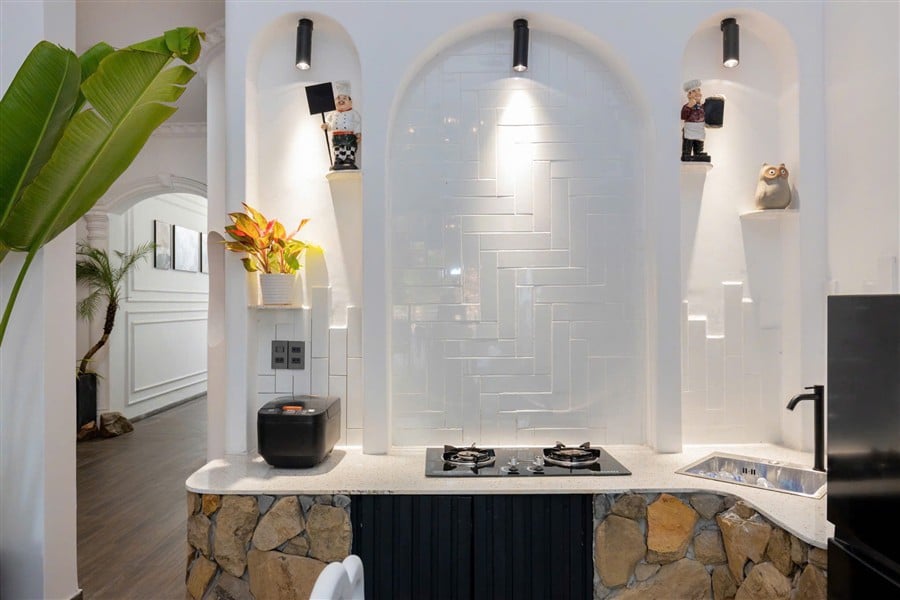 Bếp đầy đủ dụng cụ nấu ăn, bếp gas, lò nướng và gia vị cơ bản