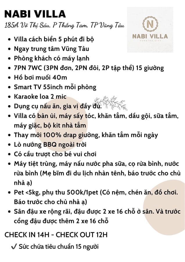 Lưu ý: Giá thuê của Villa này chỉ áp dụng cho số lượng người tiêu chuẩn và sẽ thay đổi liên tục theo từng thời điểm, tùy thuộc vào tình hình kinh doanh và số lượng người lưu trú thực tế. Quý khách vui lòng liên hệ ngay với Dịch vụ cho thuê biệt thự và Villa với không gian sống tiện nghi tại Vũng Tàu để biết thêm thông tin chi tiết và đặt phòng nhé! Chúc quý khách hàng có một chuyến nghỉ dưỡng thật hạnh phúc và đáng nhớ bên người thân & gia đình tại thành phố biển xinh đẹp Vũng Tàu!