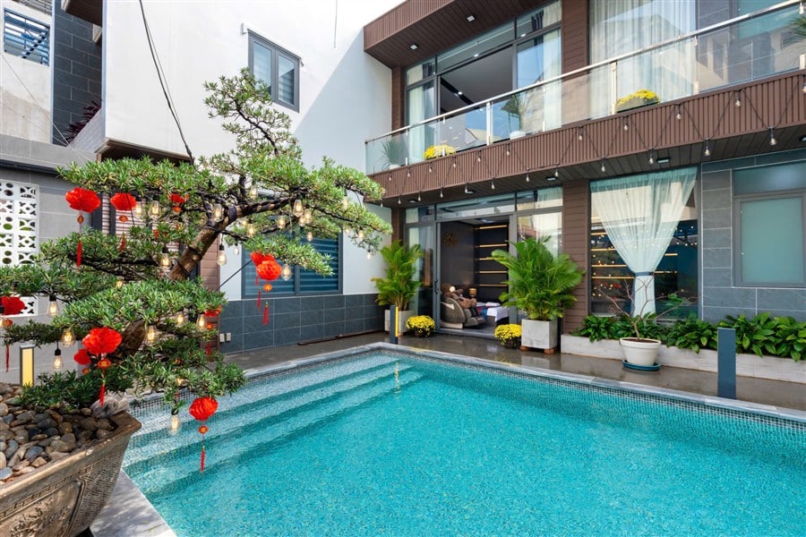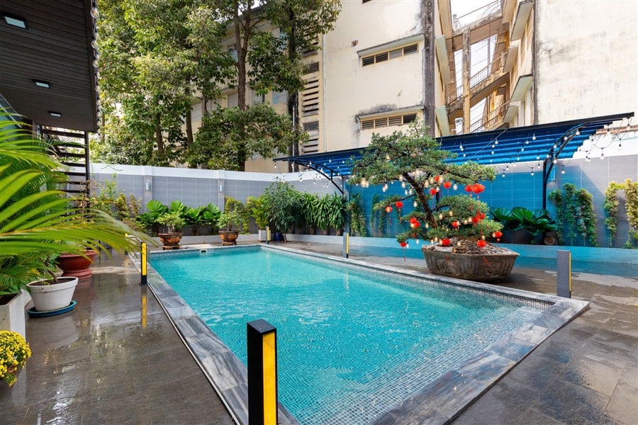 Hồ bơi ngoài trời lớn, khu vực thư giãn và sân BBQ rộng