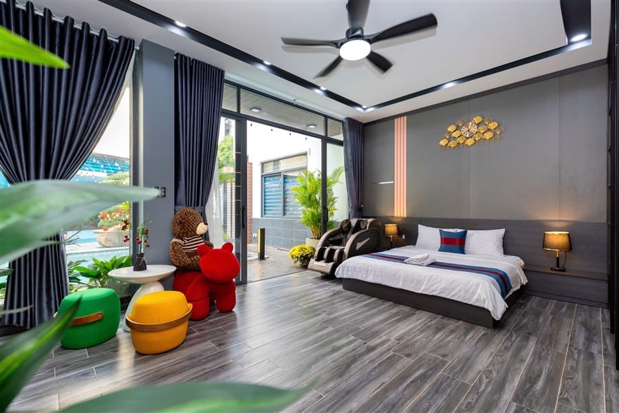 Villa được thiết kế hiện đại, gồm 2 phòng ngủ master rộng rãi, tổng cộng 2 giường lớn 1m8, đi kèm 2 WC riêng có bồn tắm sang trọng và phòng thay đồ riêng biệt. Phòng khách trang bị TV màn hình lớn, internet tốc độ cao, kết hợp với khu vực bếp đầy đủ dụng cụ nấu ăn như bếp gas, lò nướng, xoong nồi, ly chén, phục vụ tối đa cho 8 khách. Nệm phụ được chuẩn bị khi cần, đảm bảo mọi khách đều có chỗ nghỉ thoải mái.