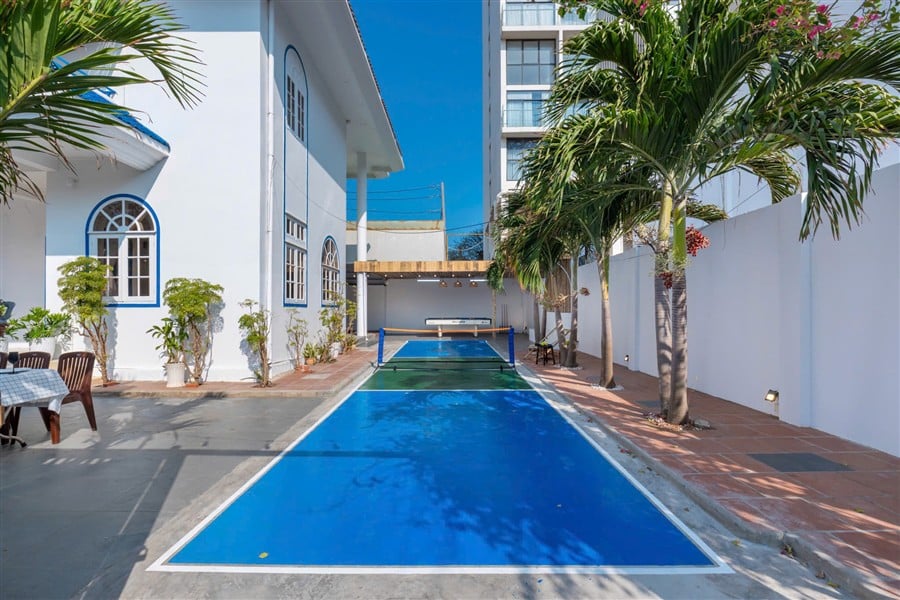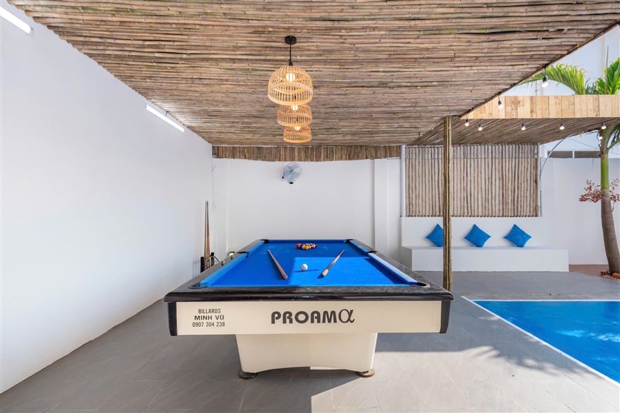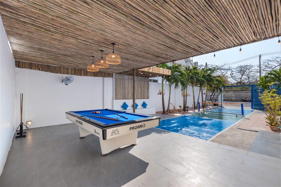Không gian giải trí được bố trí thông minh: hồ bơi ngoài trời 35m² có khu vực dành cho trẻ em, sảnh giải trí với bàn bida, phòng karaoke miễn phí cùng hệ thống loa chất lượng cao. Sân thượng và sân BBQ ngoài trời rộng rãi, kết hợp bàn ghế ăn ngoài trời, là nơi lý tưởng để tổ chức tiệc nướng, BBQ hoặc các buổi tụ họp bạn bè. Bếp được trang bị đầy đủ: bếp gas, bếp nướng BBQ, nồi, chén dĩa và gia vị cơ bản, thuận tiện cho việc chuẩn bị bữa ăn ngay tại villa. Sân trước đủ chỗ đậu 3–4 xe ôtô 4–7 chỗ, ngoài đường để xe thoải mái, cùng camera giám sát đảm bảo an toàn.