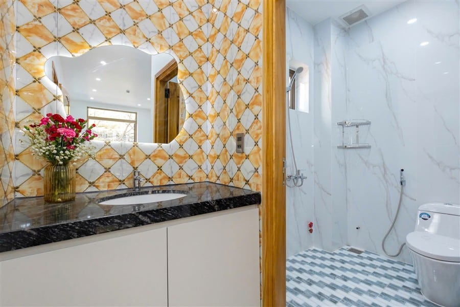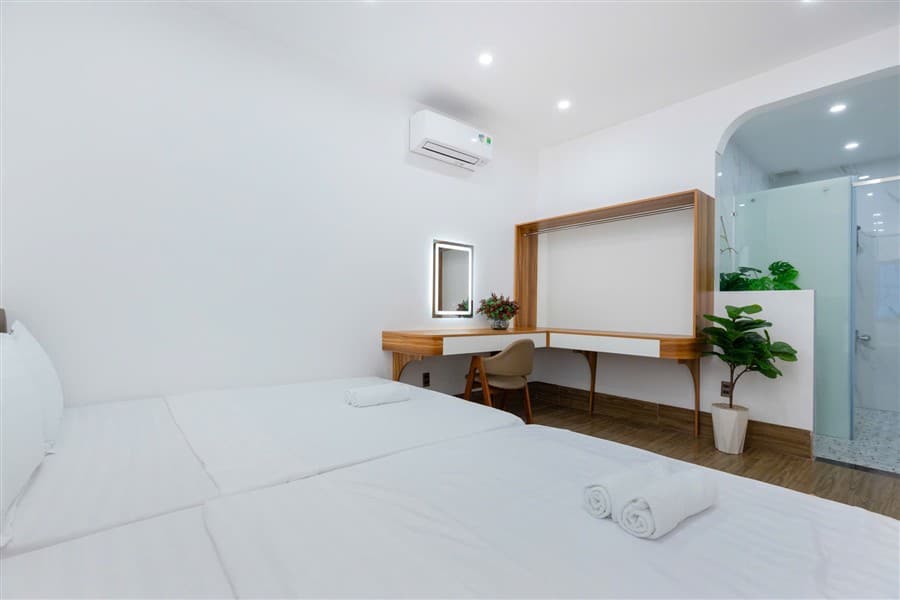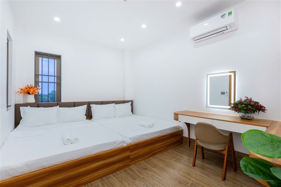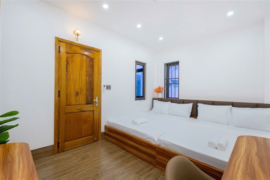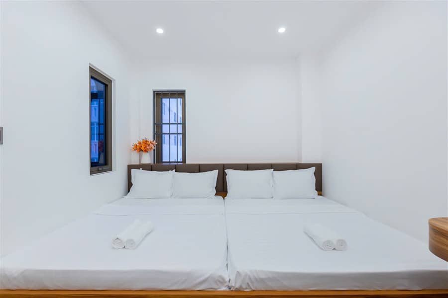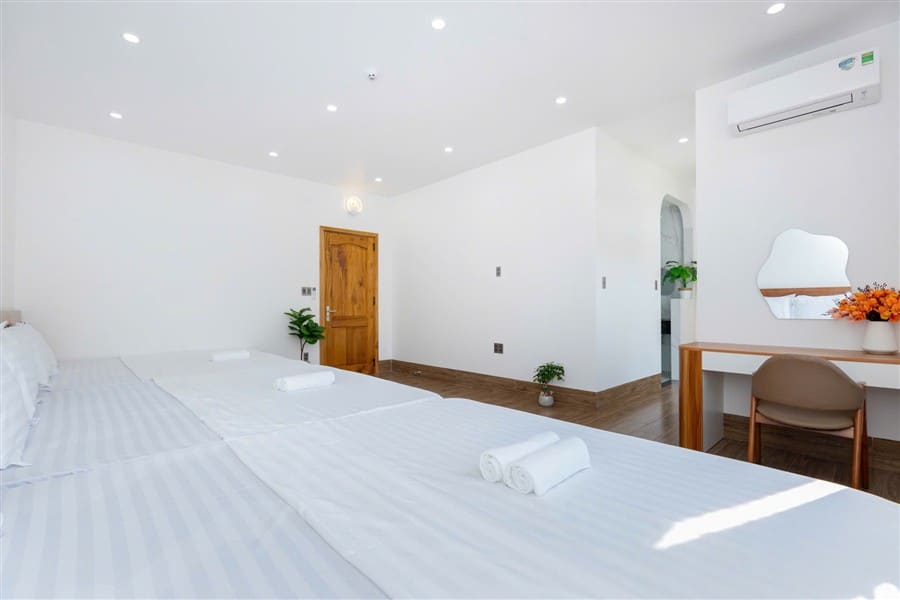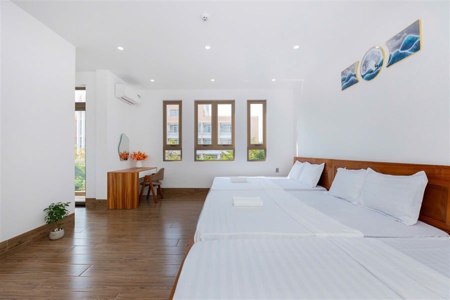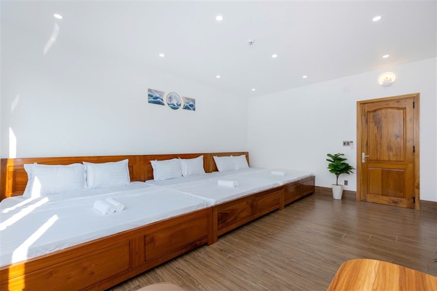 • Tầng trệt và các tầng lầu: 4 phòng ngủ, gồm 2 phòng 2 giường view cột cờ Bãi Sau, 2 phòng 3 giường, mỗi phòng đều có WC riêng