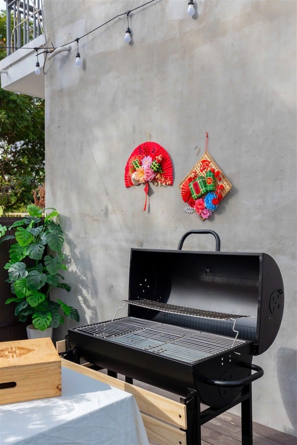 • Sân BBQ ngoài trời với lò nướng lớn, bàn ghế và dụng cụ ăn uống đầy đủ