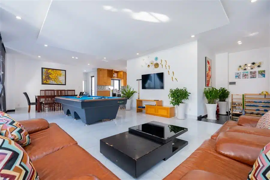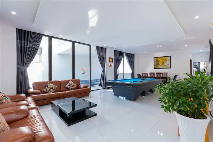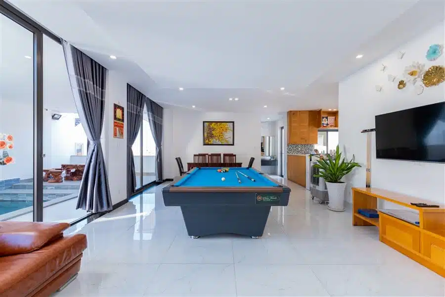 Villa 33 Vi Ba có 5 phòng ngủ, mỗi phòng được thiết kế sang trọng và thoải mái, đảm bảo mang lại sự riêng tư cho mỗi thành viên trong nhóm. Bên cạnh đó, việc trang bị các tiện ích giải trí như bàn Bida và Karaoke không chỉ làm cho kỳ nghỉ của bạn thêm phần đặc biệt mà còn tạo điều kiện cho các hoạt động vui vẻ và gắn kết giữa bạn bè và gia đình.