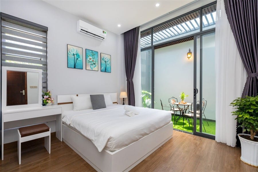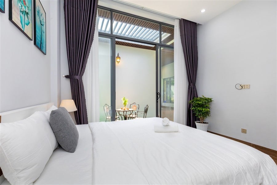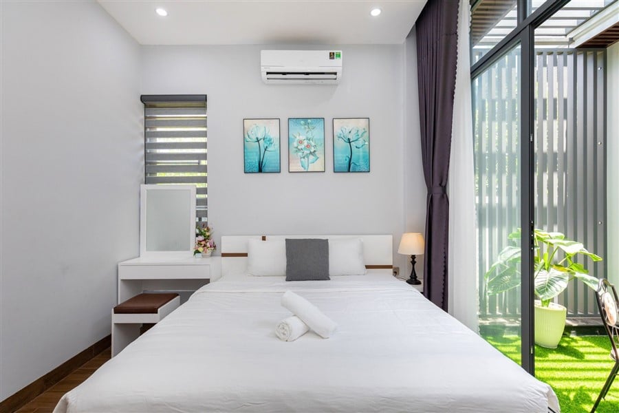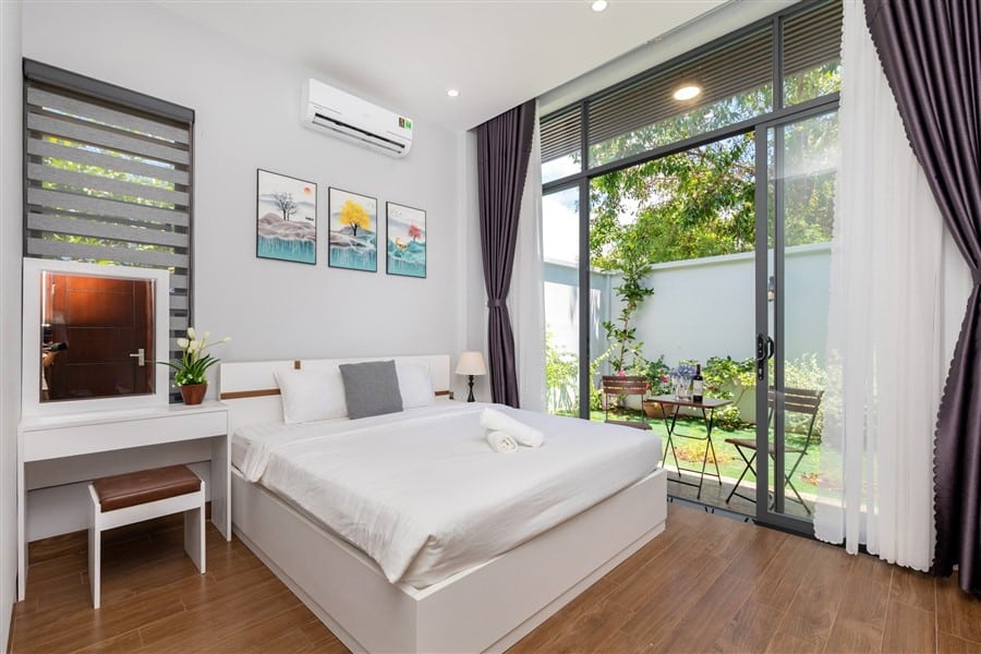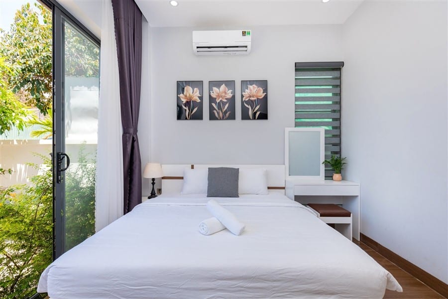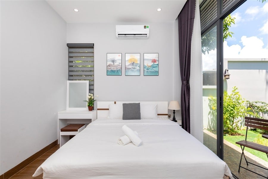 - Phòng Ngủ 1-3: Mỗi phòng có 1 giường đôi lớn, điều hòa 2 chiều, tủ quần áo, bàn trang điểm, WC khép kín, view sân vườn hoặc ban công