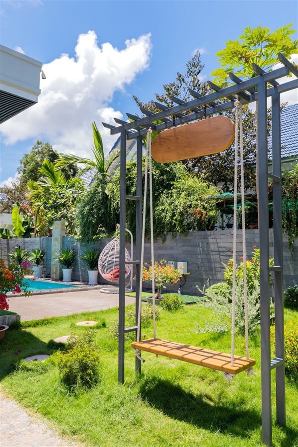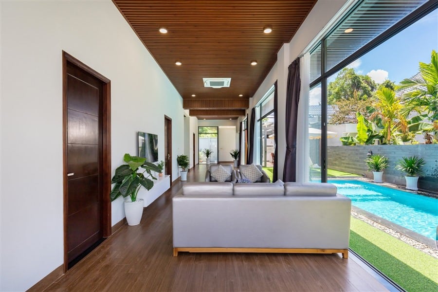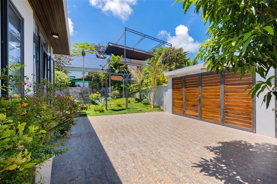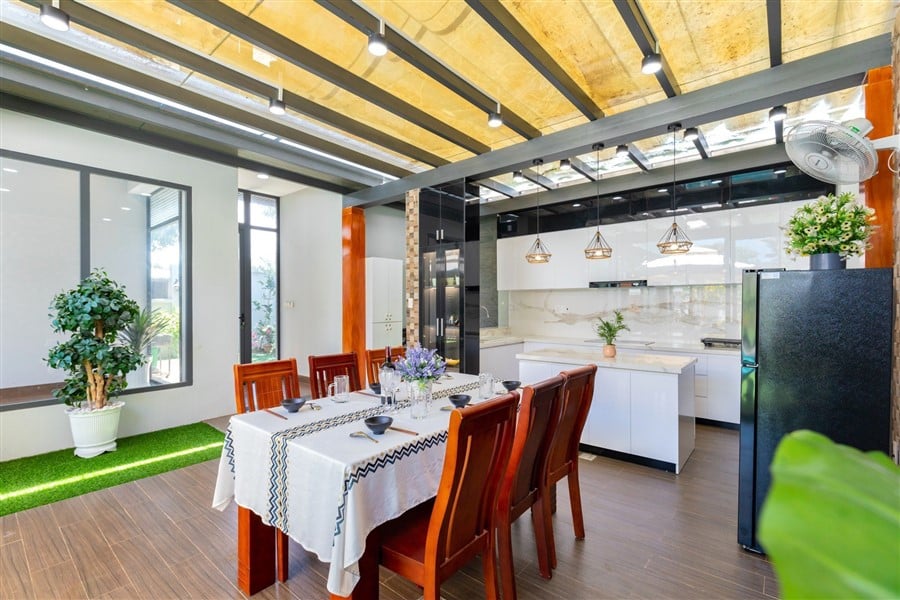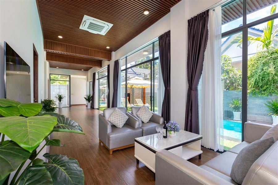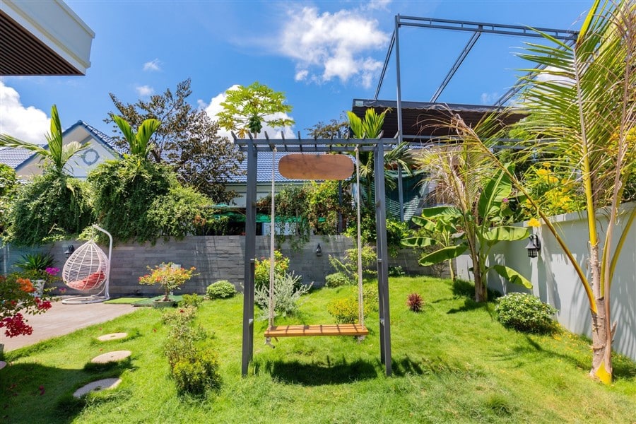 - Tiện Nghi: Máy lạnh âm trần phòng khách, bếp đầy đủ tiện nghi, hồ bơi 32m2 thác nước, khu BBQ ngoài trời