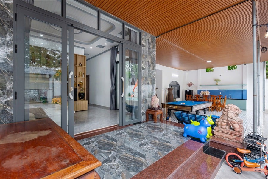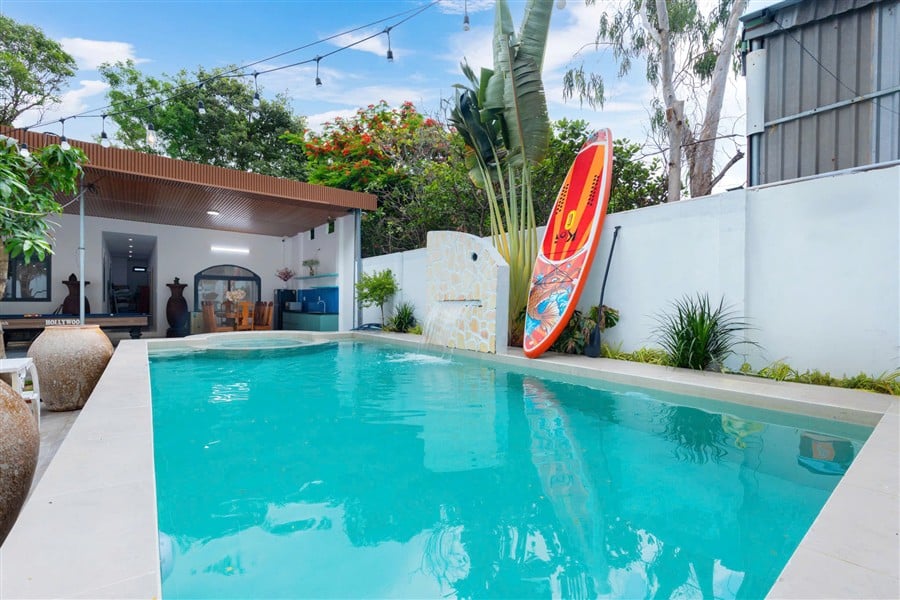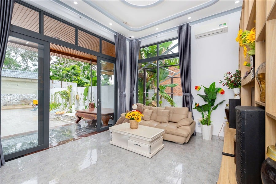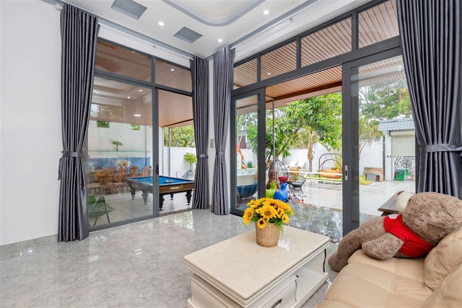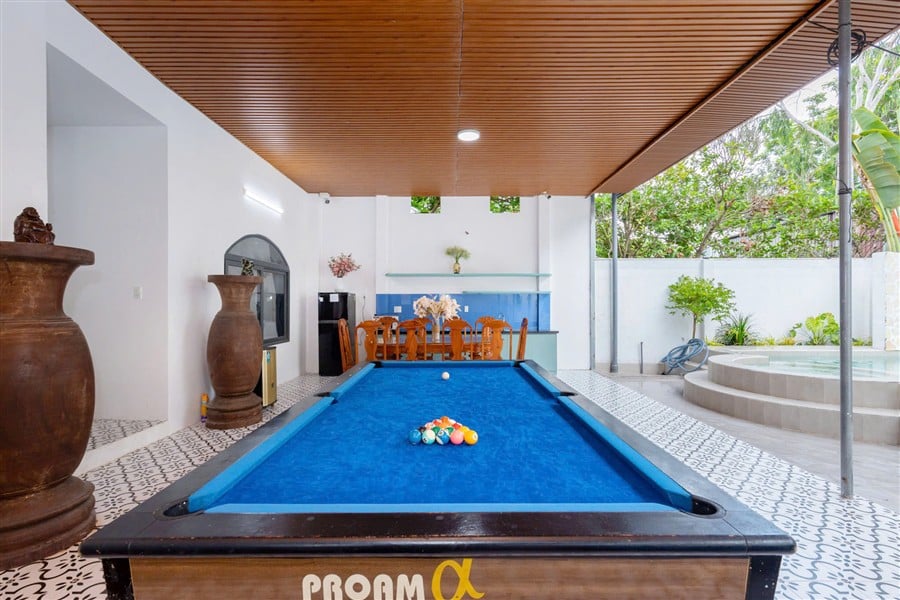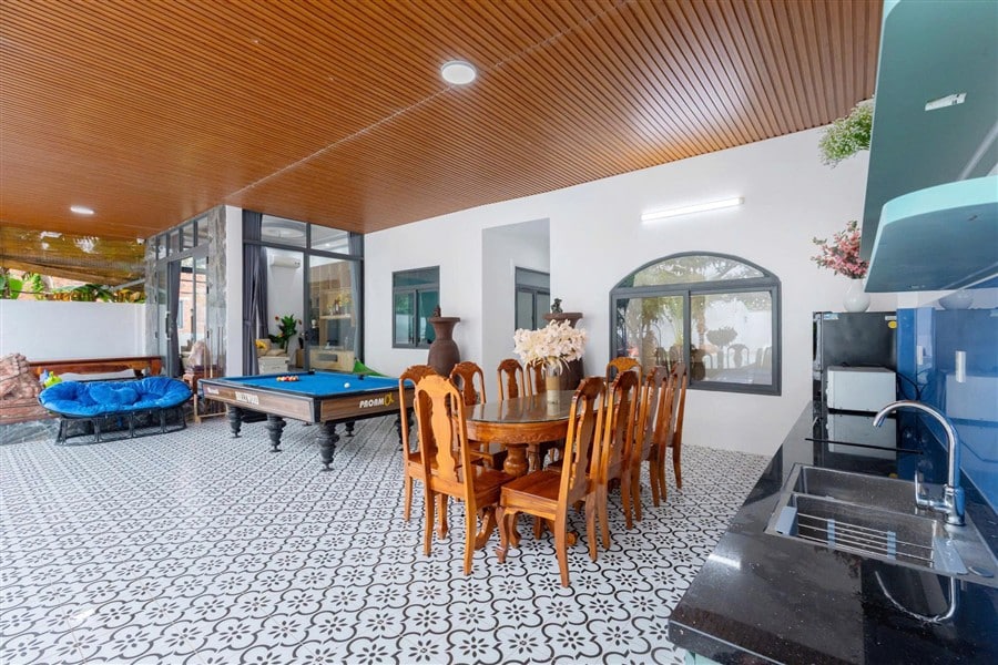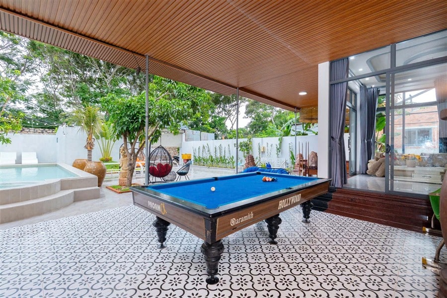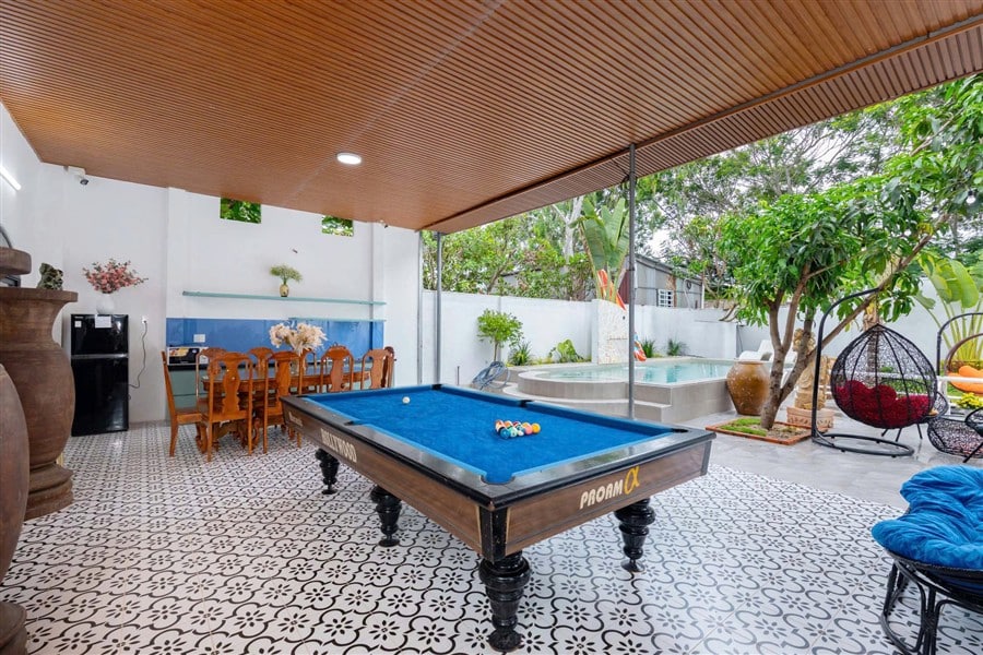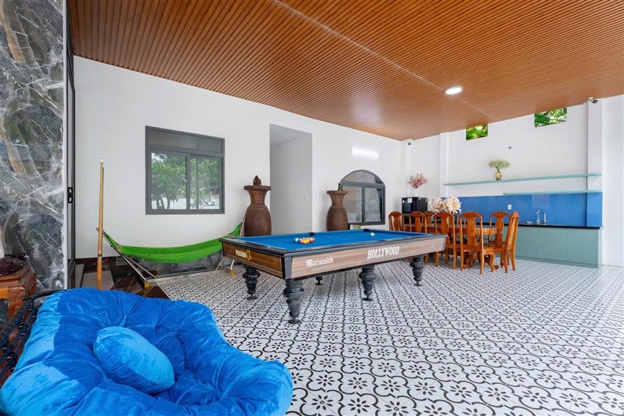 Biệt thự được thiết kế theo phong cách nghỉ dưỡng hiện đại, sang trọng, với hồ bơi riêng 50m², sân vườn rộng, phòng karaoke, bàn bida, SUP chèo, và đầy đủ tiện nghi sinh hoạt.