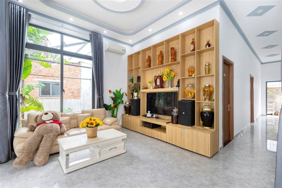 Phòng khách lớn, sofa, TV, máy lạnh, dàn karaoke.