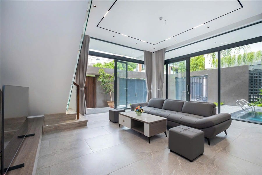 ✅ Phòng khách rộng, sofa sang trọng, TV màn hình lớn