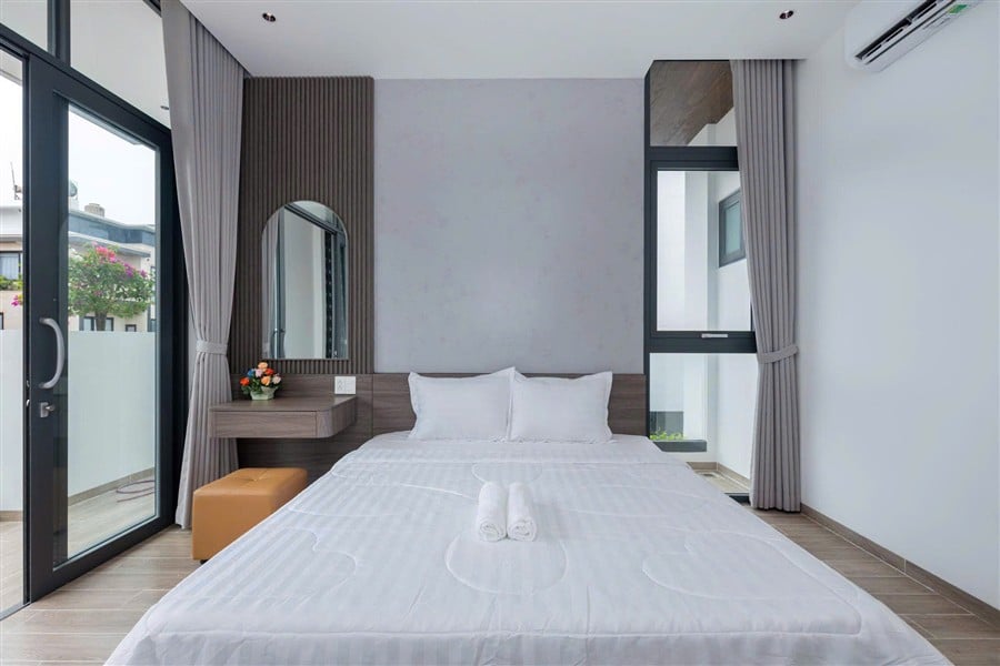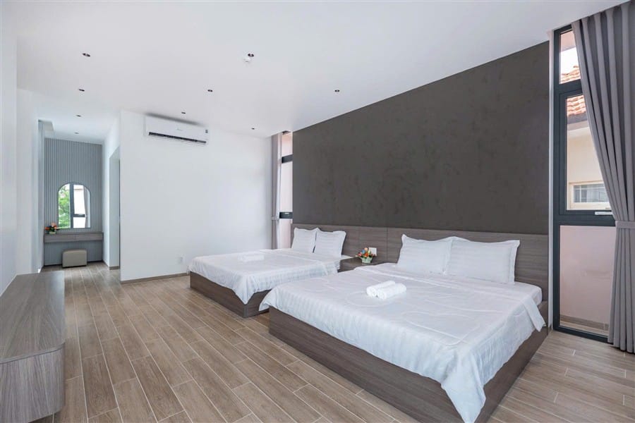 Villa gồm 5 phòng ngủ, tổng cộng 6 giường lớn và 4 nệm phụ, sức chứa tiêu chuẩn 15 khách và tối đa 20 khách lớn nhỏ khi sử dụng thêm nệm. Các phòng ngủ được bố trí linh hoạt, gồm phòng đôi, phòng đơn và phòng tập thể, mỗi phòng đều có WC riêng, máy lạnh và ban công thoáng mát. Nội thất hiện đại, tiện nghi đầy đủ, bao gồm TV màn hình lớn, bàn ủi, máy sấy tóc, khăn tắm, dầu gội, sữa tắm và bộ kit nhà tắm dùng 1 lần, đảm bảo trải nghiệm nghỉ dưỡng trọn vẹn cho khách.