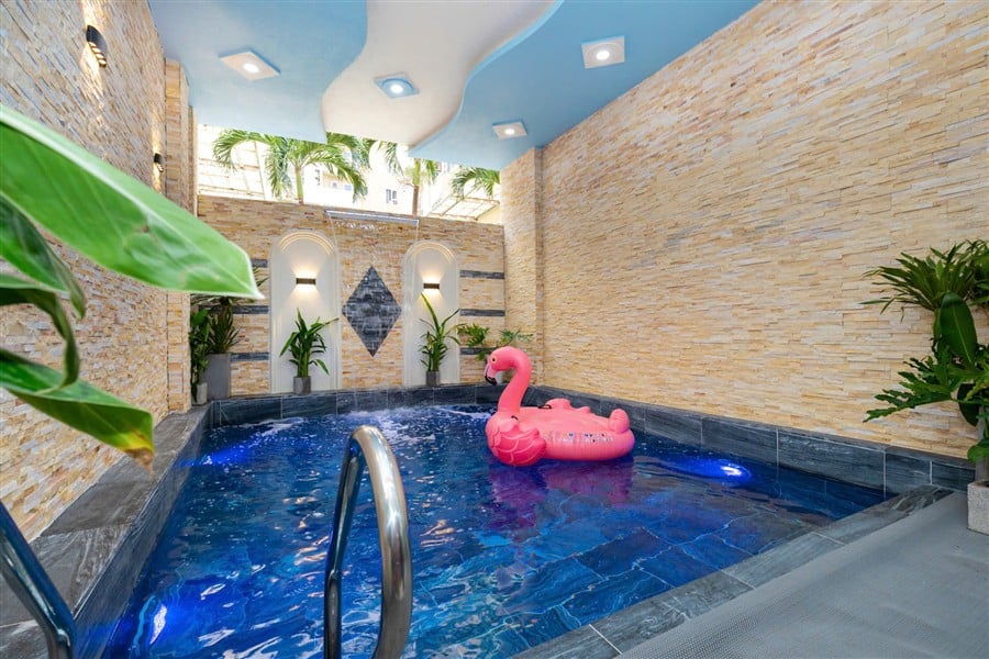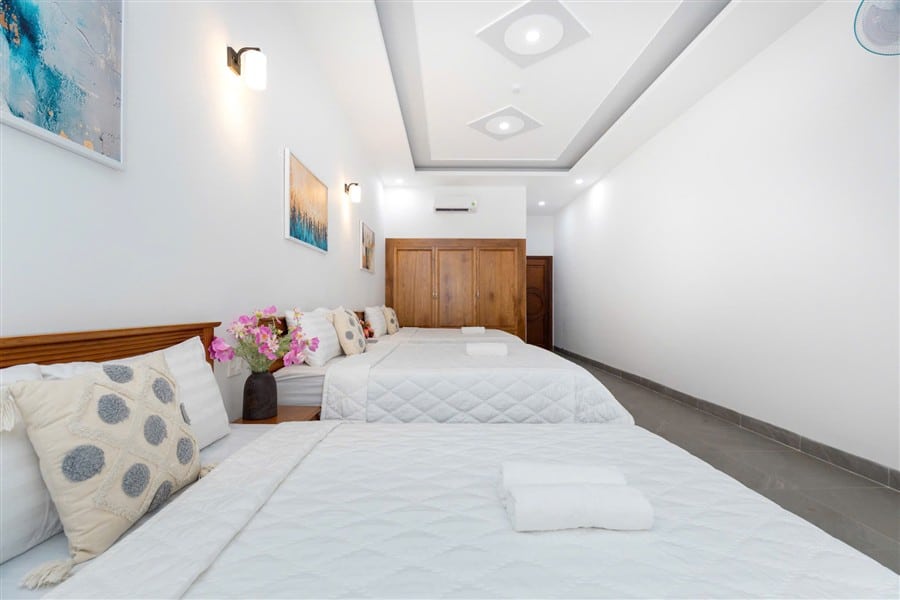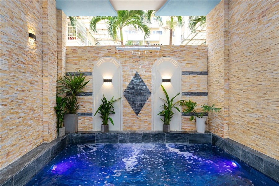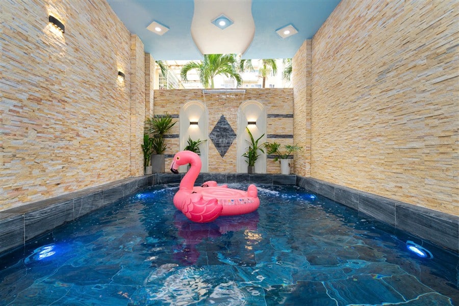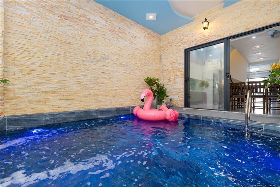 Villa có 6 phòng ngủ, 9 giường lớn, 7 phòng vệ sinh, đủ sức chứa cho nhóm từ 15–25 khách. Hồ bơi rộng 24m² cùng khu vực giải trí hiện đại với phòng karaoke miễn phí, sân rộng và bếp BBQ ngoài trời tạo điều kiện hoàn hảo để thư giãn, tổ chức tiệc gia đình hoặc liên hoan nhóm. Thang máy tiện lợi giúp di chuyển dễ dàng giữa các tầng.