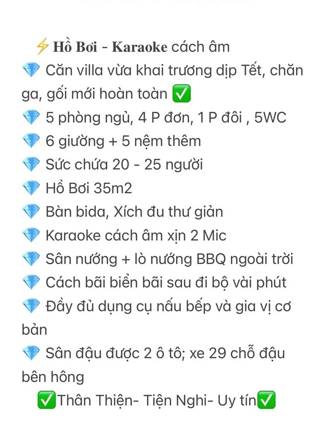 Nơi đây được trang bị đầy đủ tiện nghi như hồ bơi 35m2, khu BBQ, phòng karaoke tiêu chuẩn, và sân vườn xanh mát. Villa cũng có bãi đậu xe rộng rãi và dễ dàng đỗ xe cho nhiều phương tiện. Quy định phụ thu và giá phòng linh hoạt, phù hợp với nhu cầu của từng đoàn khách.