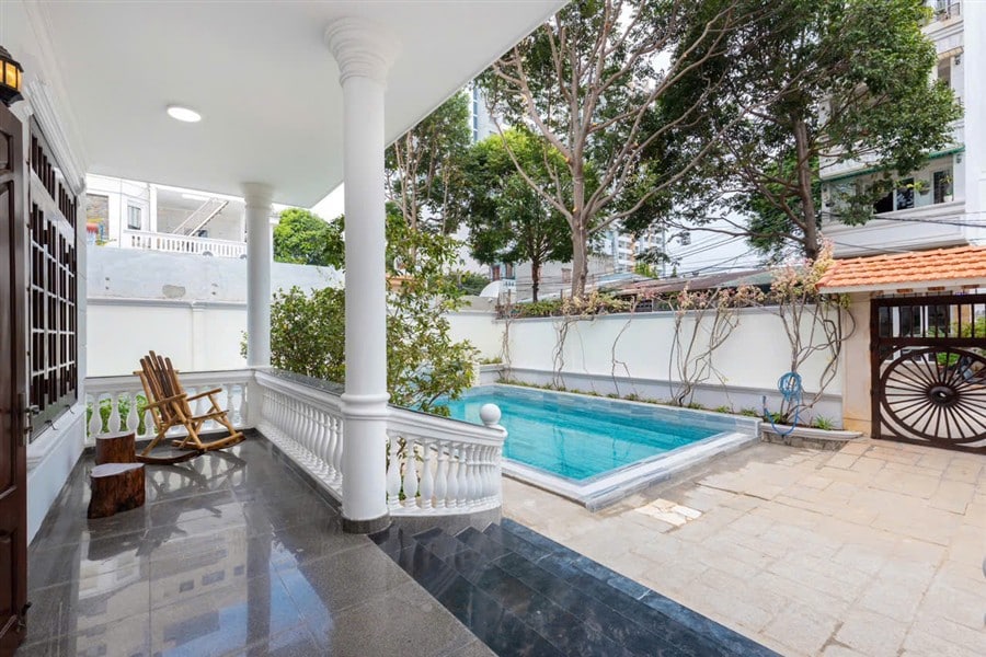 • Tầng trệt: 3 phòng ngủ, phòng khách, bếp, khu vực hồ bơi, sân BBQ và phòng karaoke