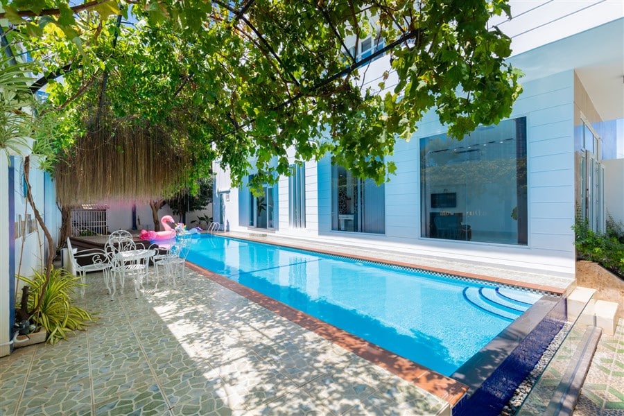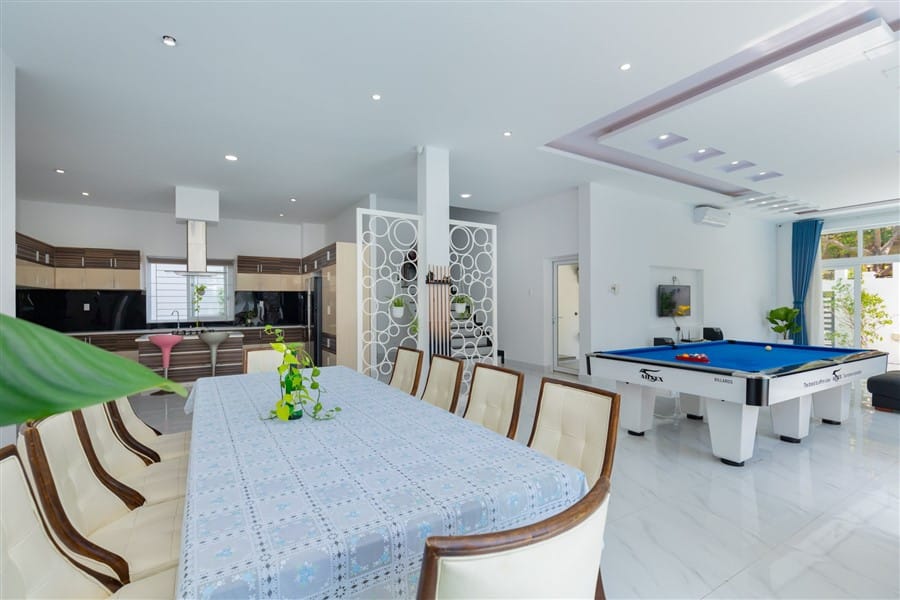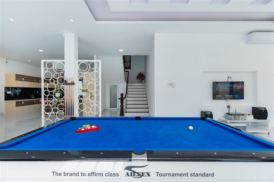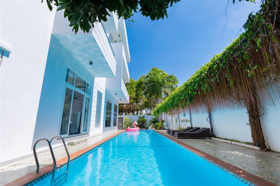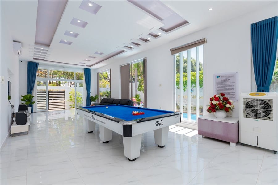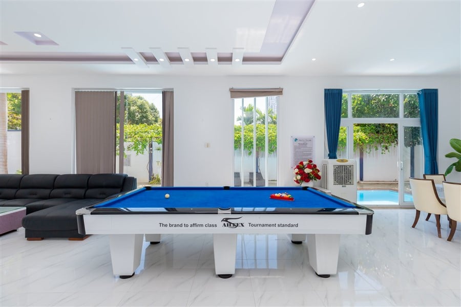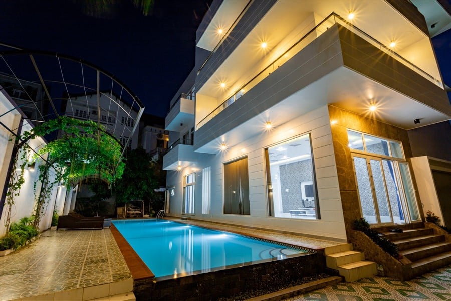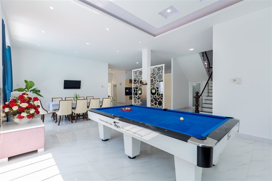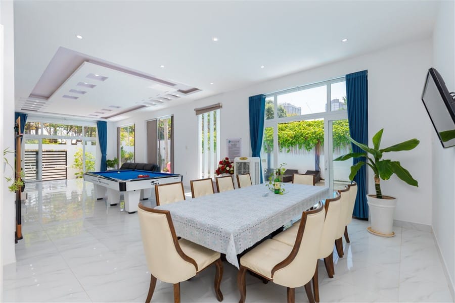Villa này có 8 phòng ngủ và 9 nhà vệ sinh, có thể chứa tới 25 người, rất phù hợp cho các nhóm lớn hoặc gia đình đông thành viên. Villa C5 Nguyễn Cư Trinh cũng được trang bị đầy đủ tiện nghi như hồ bơi, bàn Bida, và hệ thống Karaoke, đảm bảo một kỳ nghỉ giải trí và thư giãn tuyệt vời.