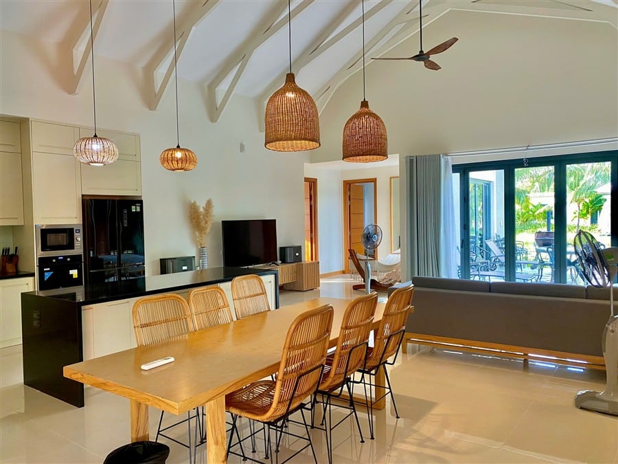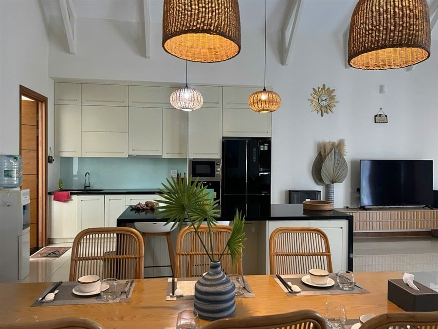 Không gian nội thất được thiết kế ấm cúng, hiện đại, đầy đủ tiện nghi, phù hợp cho cả kỳ nghỉ ngắn ngày lẫn dài ngày tại villa Hồ Tràm.