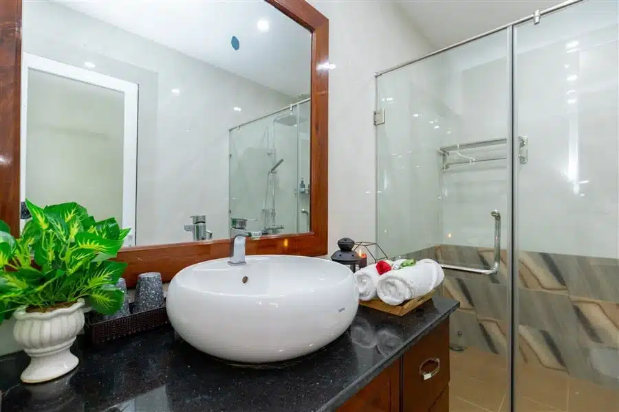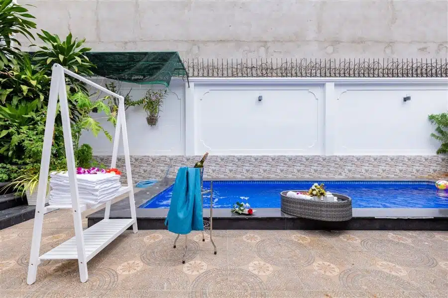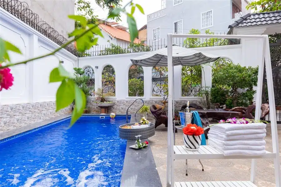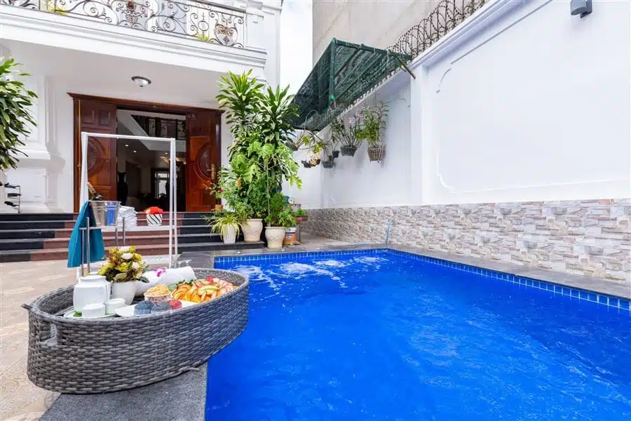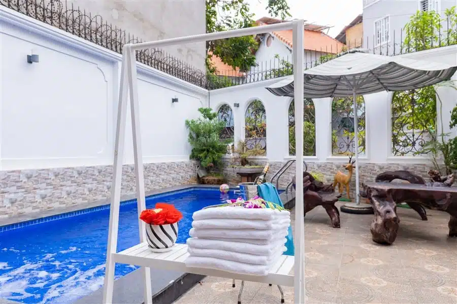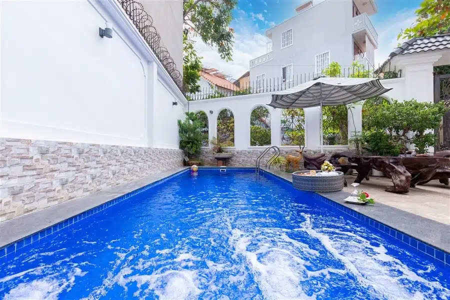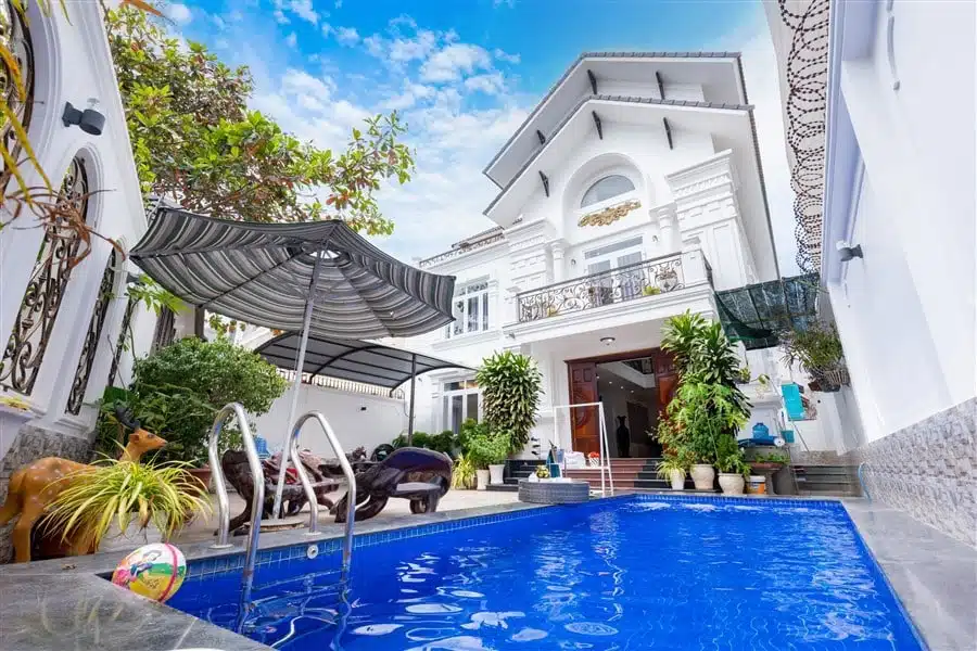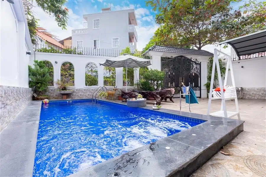 Villa bao gồm 5 phòng ngủ và 4 phòng vệ sinh, trong đó có 3 phòng vệ sinh trong phòng ngủ, phù hợp cho gia đình lớn hoặc nhóm bạn. Đặc biệt, hồ bơi nhỏ có diện tích 25m2 và chỉ cách biển Vũng Tàu khoảng 700m, mang đến sự tiện lợi cho du khách muốn tận hưởng không gian biển.